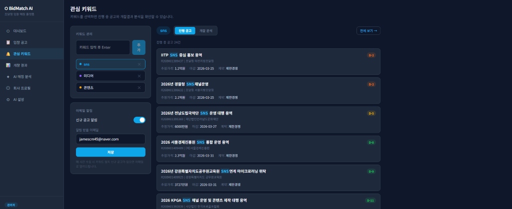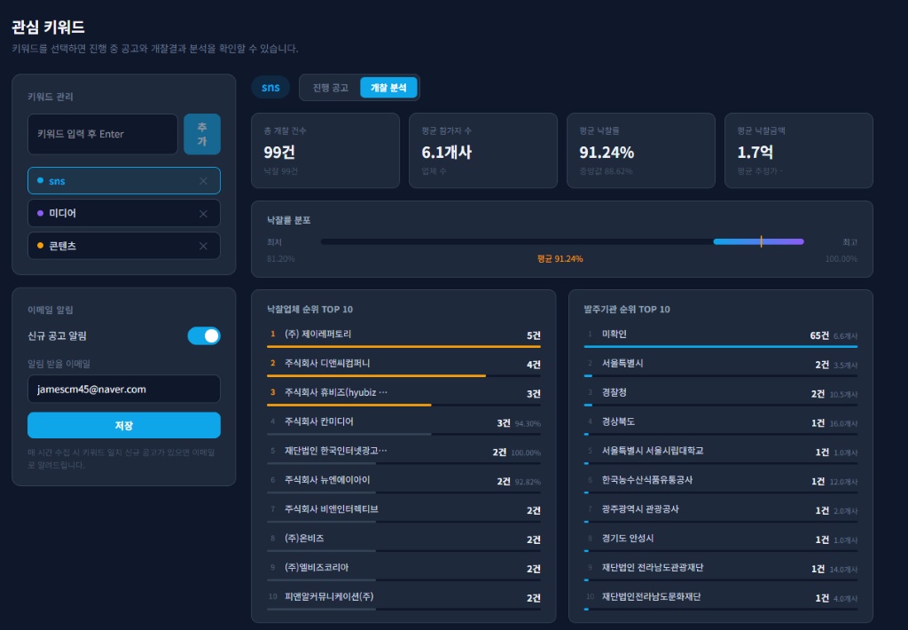 기존에는 입찰공고를 매일 확인하고, 공고내용과 과거 이력을 파악하고 했었는데. 이젠 맞춤 공고가 알람이 오고, 과거이력도 키워드별로 파악할 수 있어서 너무 편해졌습니다.